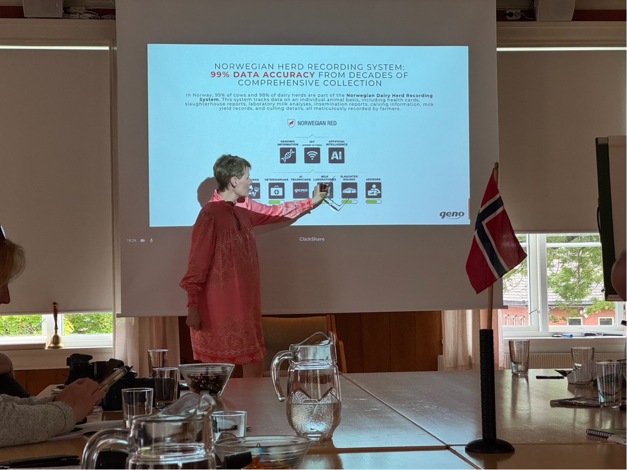 Near Oslo airport, the last farm the group visited is a dairy one, owned by Torynn and Hans-Petter Aurstad which conduct tests and measures of methane emission for Geno on their norwegian red cows.